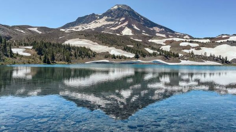 We have hiked in the Three Sisters Wilderness many times and have always enjoyed our experience. However, accessing views of Collier Glacier can be a bit of a challenge. Located in the saddle between North and Middle Sister, Collier Glacier views, on the north edge of Collier Cone, are obtained after a seven and a half mile hike from Lava Camp Lake Trailhead through Matthieu Lakes or the Obsidian Trailhead. While only 1/2 mile off the Pacific Crest Trail, to reach the edge of Collier Cone involves a scramble up a steep pumice hill, but once you arrive, the setting is spectacular with the glacial lake and towering vistas of North and Middle Sister and Little Brother. We hiked this trail 7-15-23 during one of the hottest days of the year. Although we started the hike early, it took almost 8 hours to complete it and much of the trail was exposed to the sun in lava fields or burned forest. However, there were beautiful shaded areas near Matthieu Lakes and our experience was wonderful. We brought a lot of water and enjoyed refilling a water container at Minnie Scott Spring where water can be seen percolating through the small stones. The total hike was over 15 miles and over 2500 feet of elevation gain.