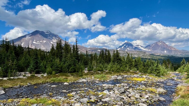 However, one of the most special things about Golden Lake is the small stream which flows into the western side of the lake. Besides the numerous wildflowers growing on each side of the stream, people who take the time to hike the mile up that stream reach an isolated area that very few people ever visit. That last mile is steep, but the cascading stream with its wildflowers and ever changing views of the Three Sisters are amazing. At the end of the stream is a moraine which contains two springs which form the stream. People who scramble up the moraine will reach an isolated tarn lake and past that, another moraine and a second tarn lake even more special than the first. This second lake has phenomenal reflections and views of Broken Top. For those who are able to travel the entire distance, the reward can be some of the most breathtaking natural sights in Central Oregon. It is truly an exceptional place.